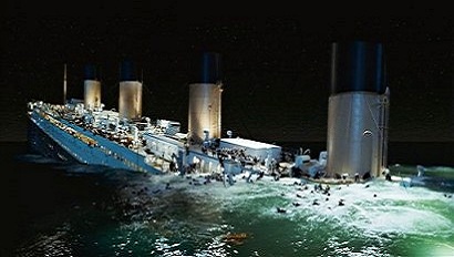 Jack y Rose llegan a la popa donde se conocieron, ahora elevada. El barco se parte de nuevo, y la popa queda suspendida verticalmente hasta que se sumerge. En el agua helada, Jack ayuda a Rose a subir a un panel de madera, y le hace prometerle que seguirá adelante viviendo una vida plena. Pasado un tiempo, un bote llega a